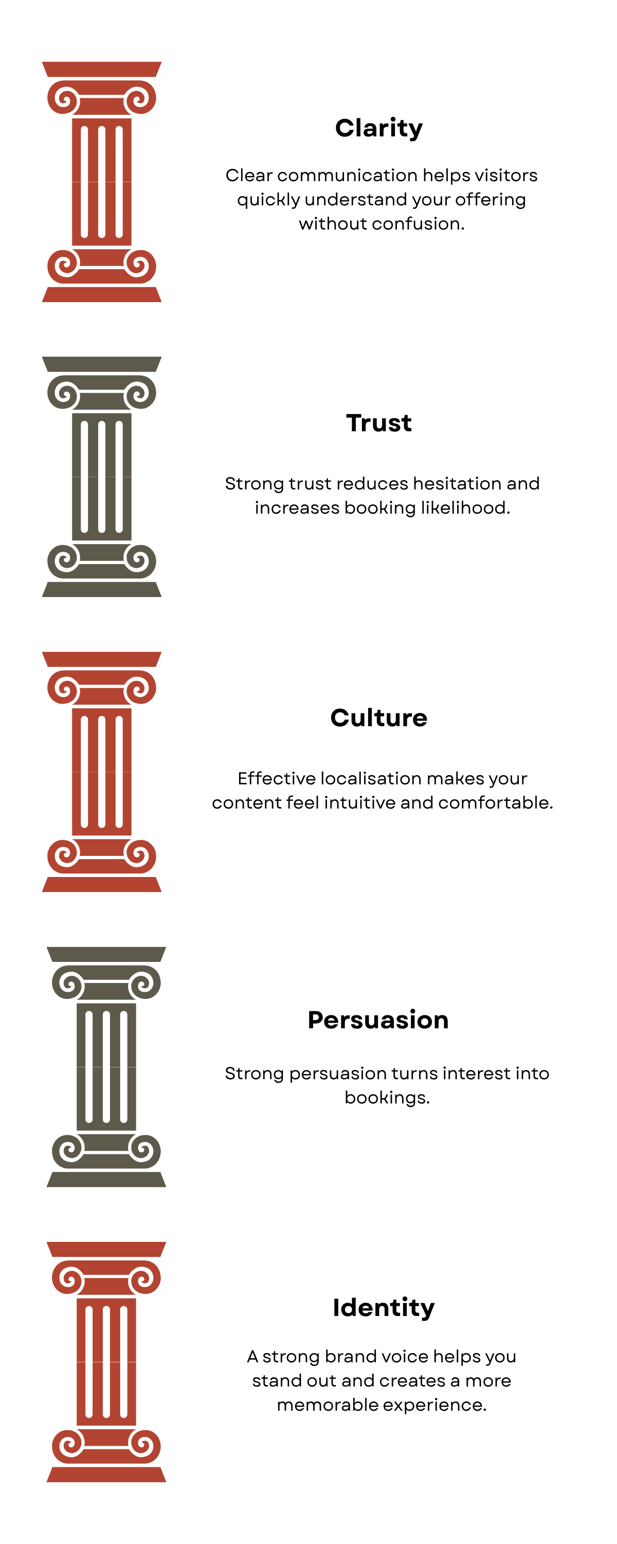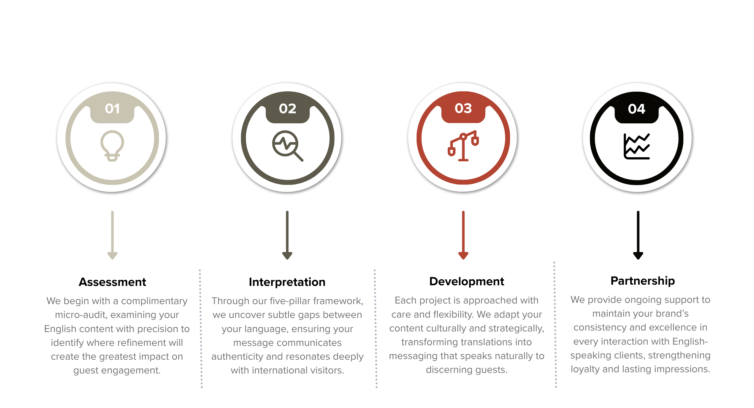 Our framework goes beyond translation to evaluate how effectively your English content communicates with Western tourists. We assess clarity, trust, naturalness, persuasion, and brand voice—giving you a complete picture of how your content performs.