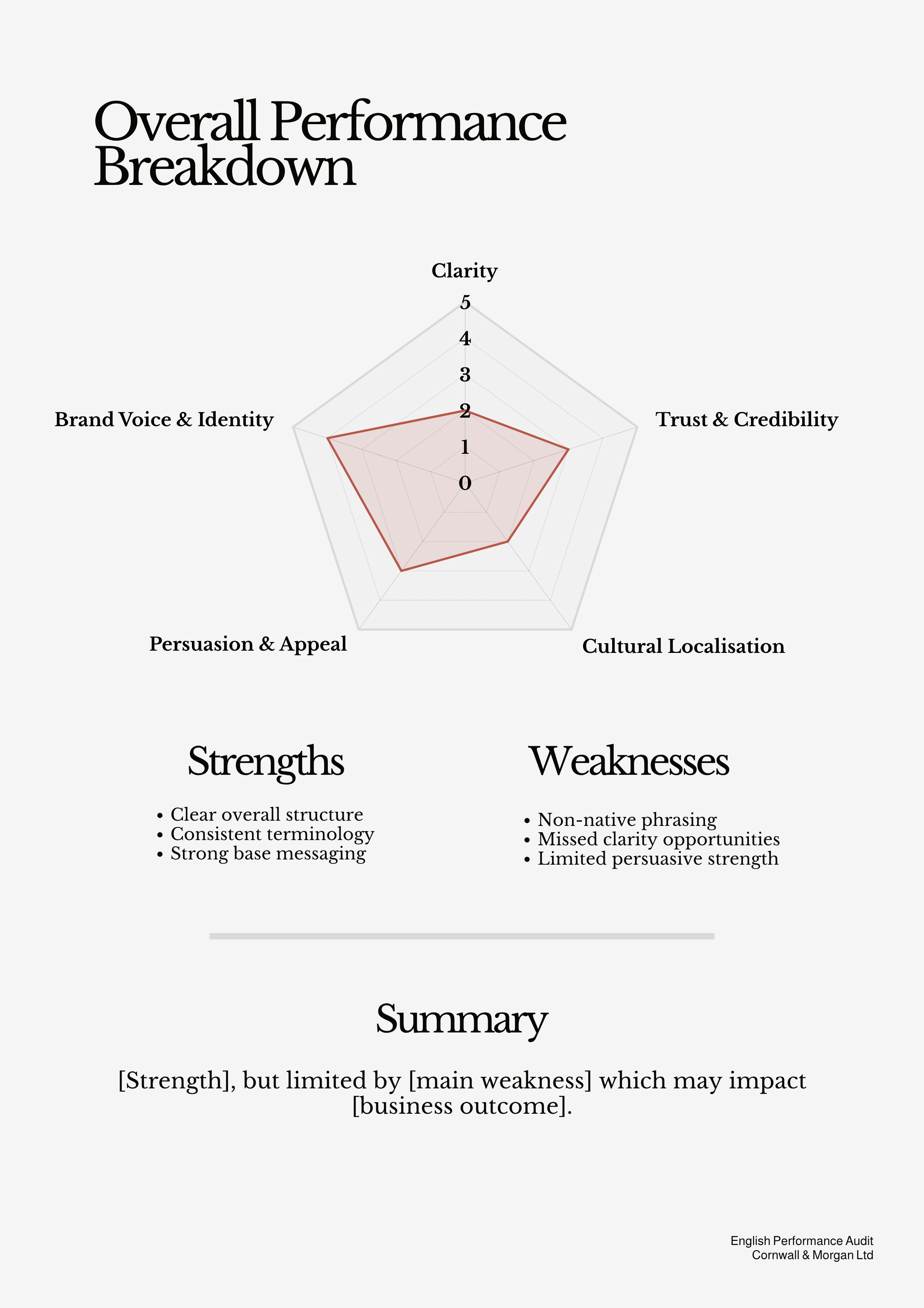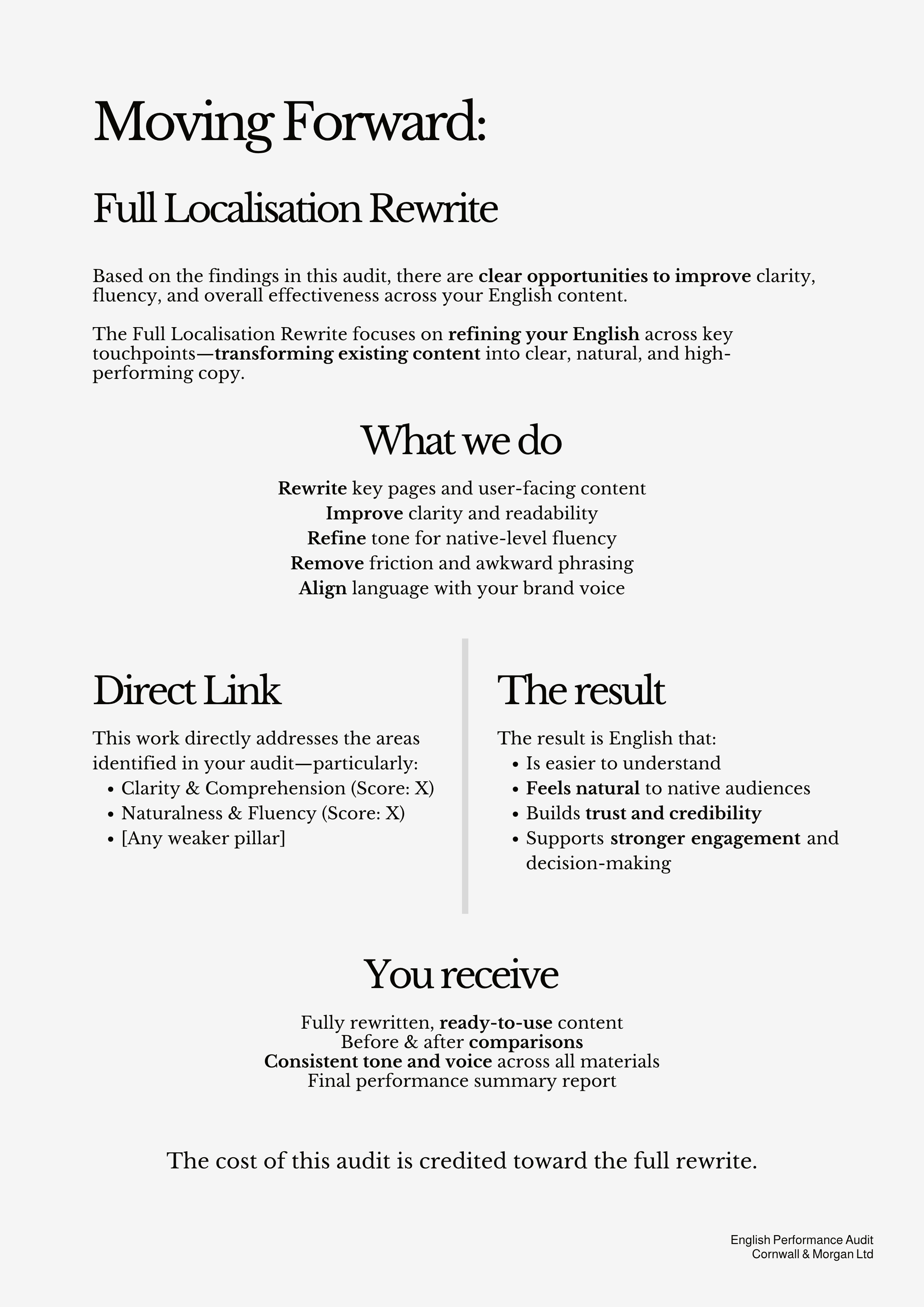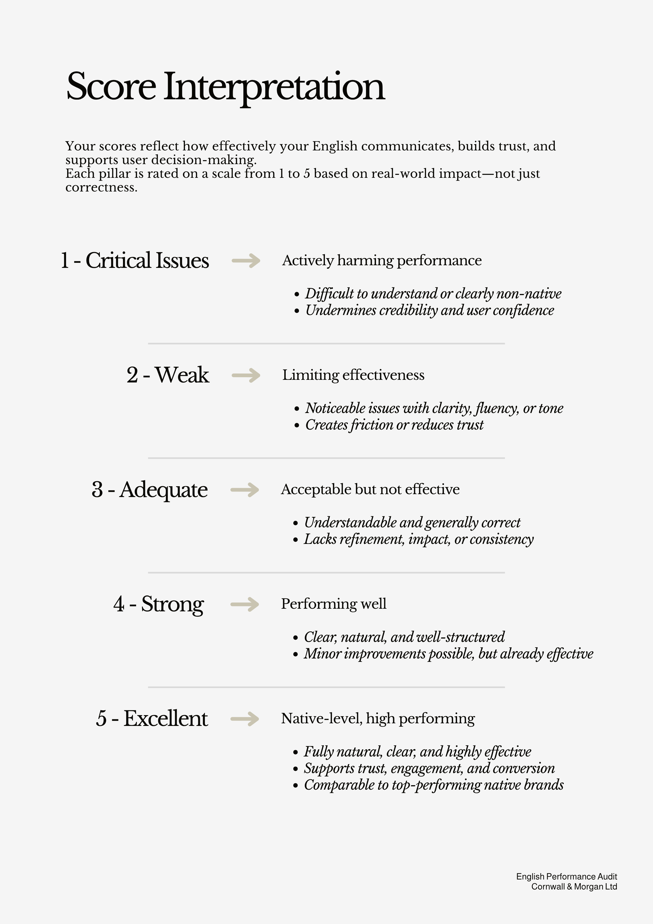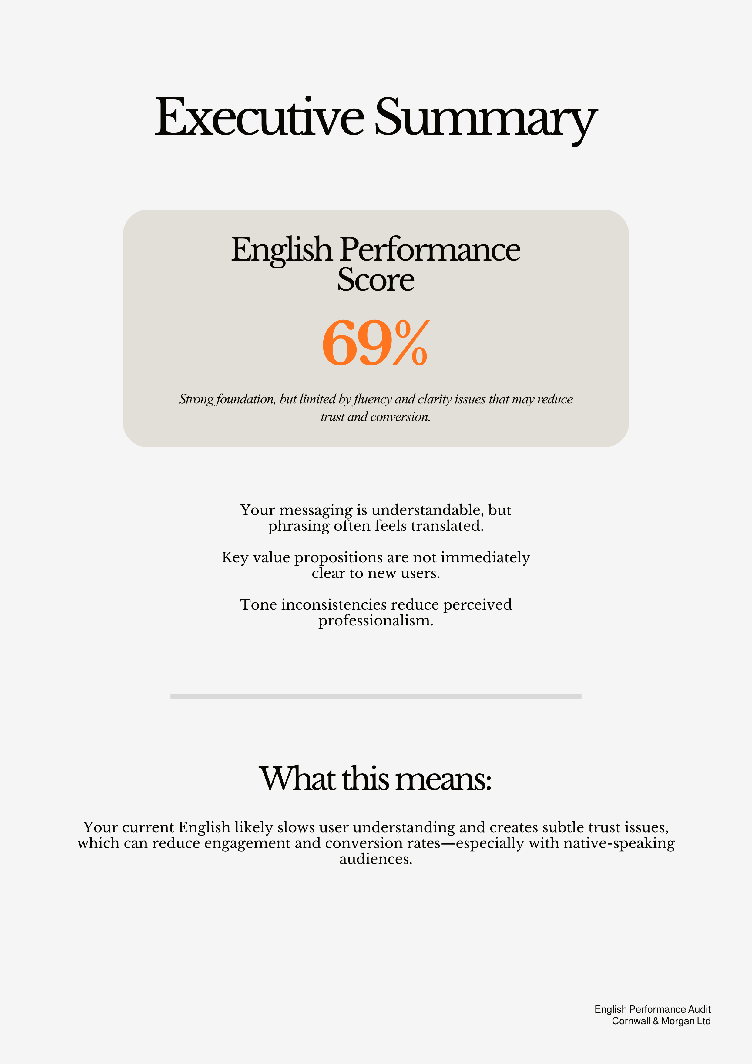 We refine your English across key touchpoints, ensuring it feels natural, consistent, and aligned with the expectations of an international audience.
