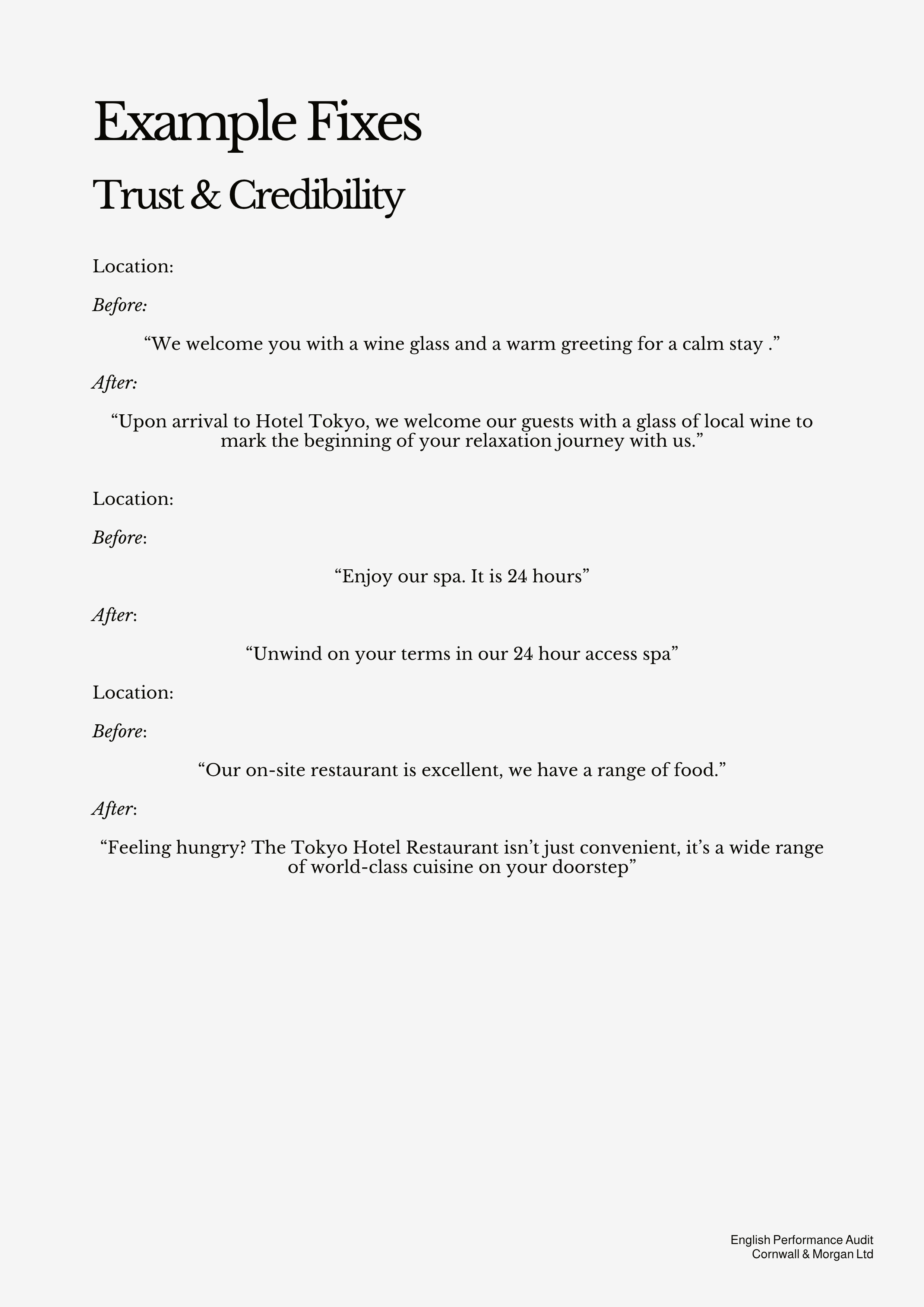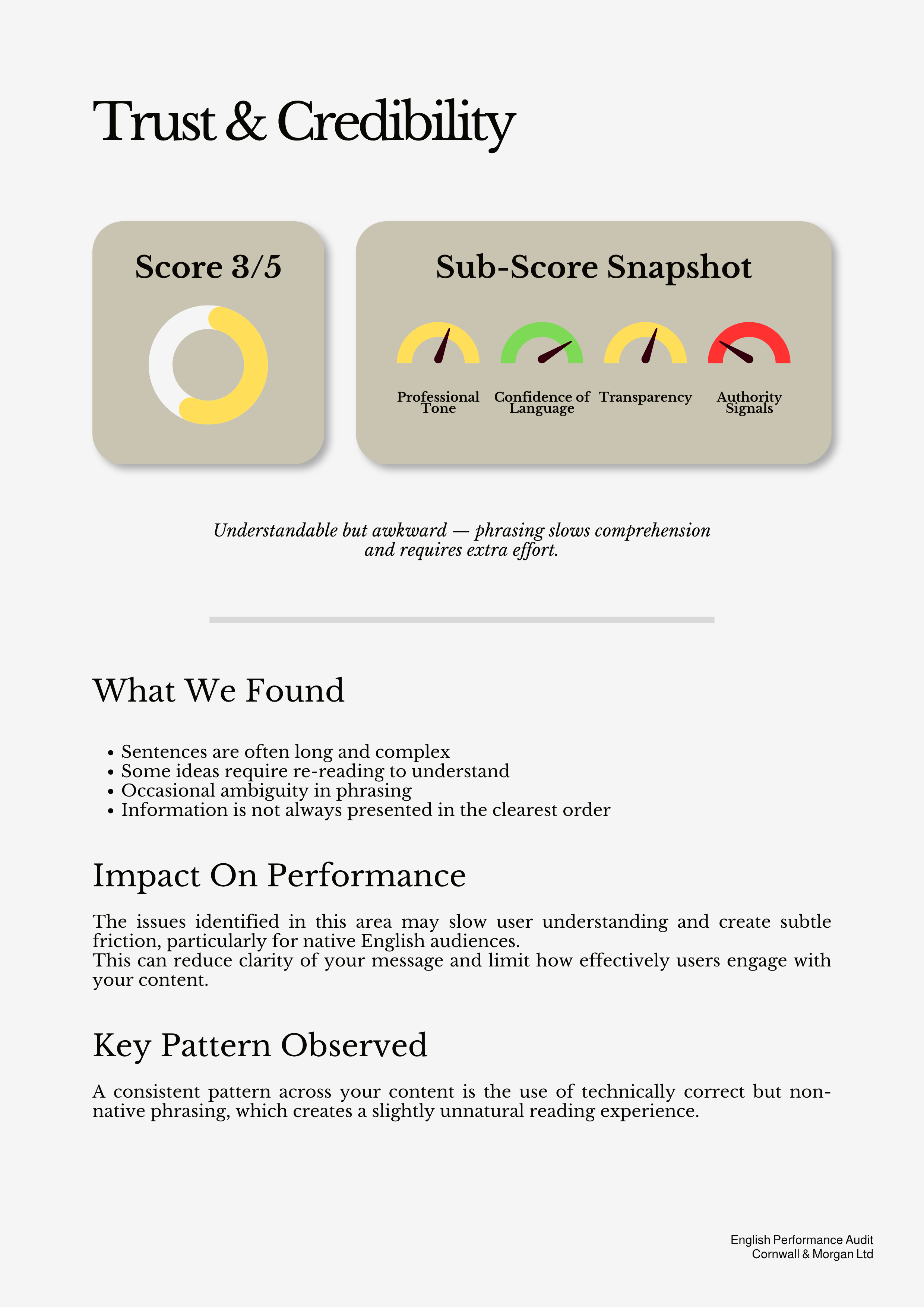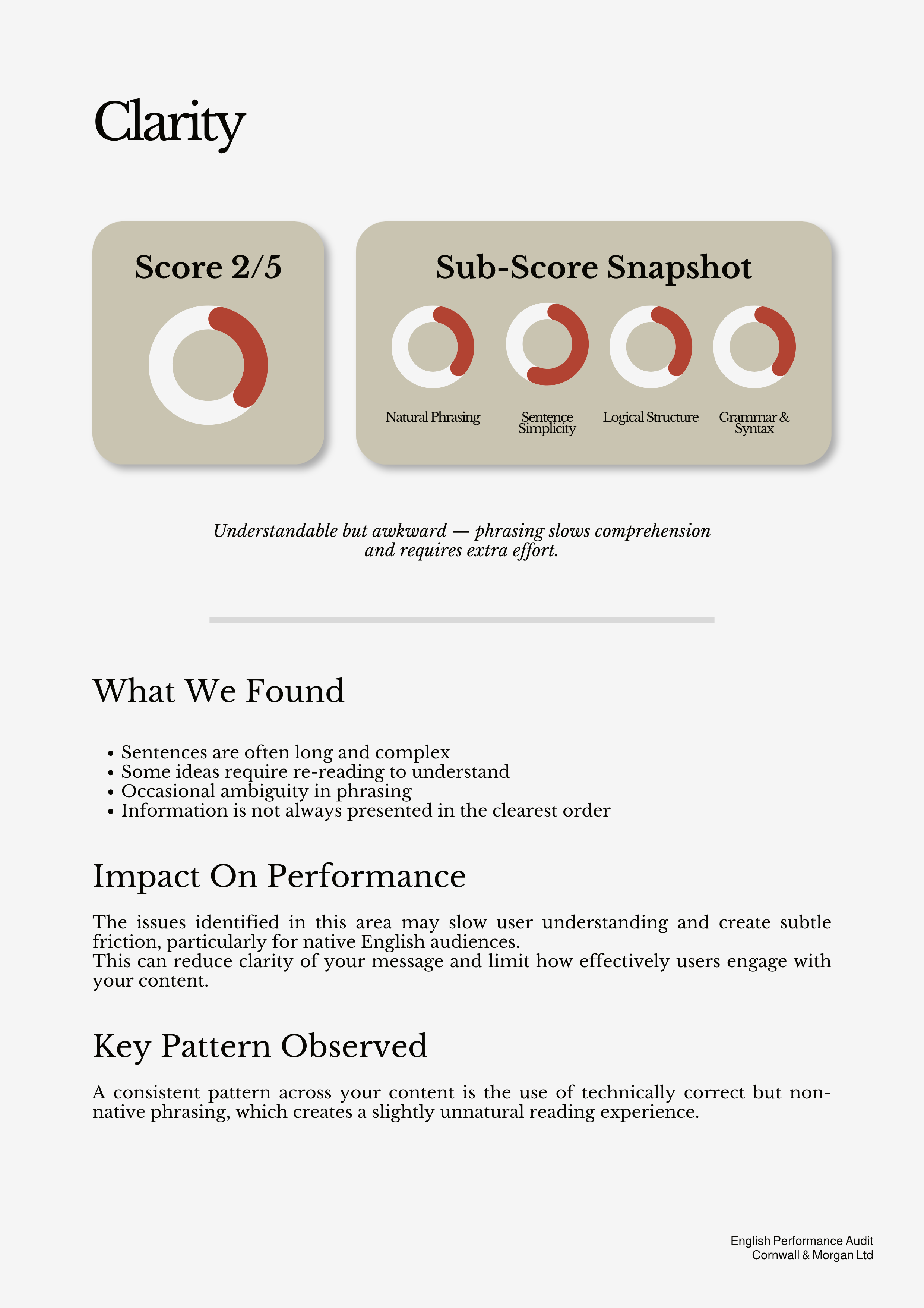 You receive a clear performance score and insight into where language may be creating hesitation or limiting conversion.